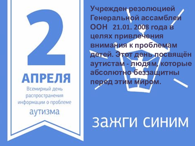 привлечения внимания к проблемам детей. Этот день посвящён аутистам - людям, которые абсолютно беззащитны перед этим миром.