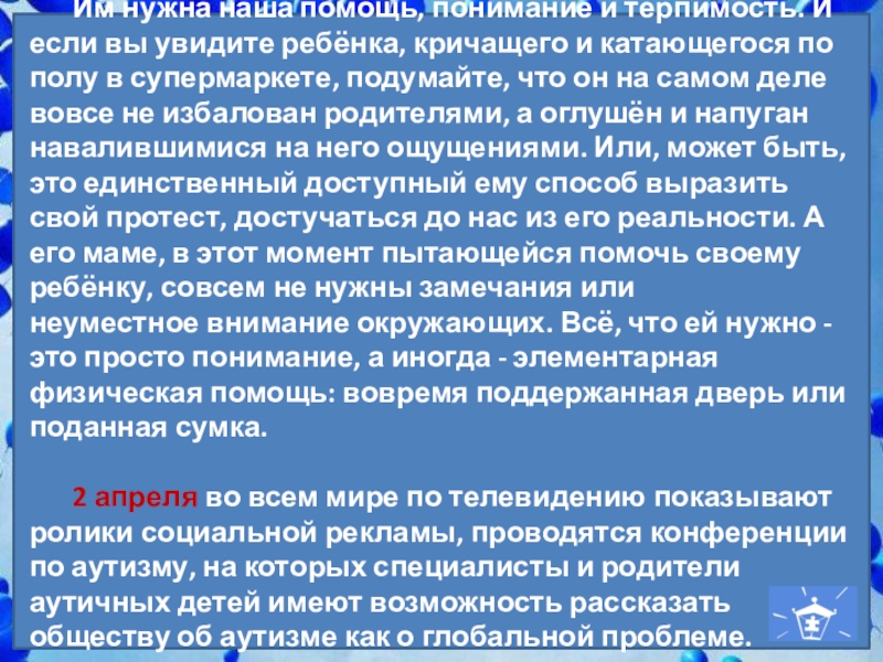 2 апреля во всем мире по телевидению показывают ролики социальной рекламы, проводятся конференции по аутизму, на которых специалисты и родители аутичных детей имеют возможность рассказать обществу об аутизме как о глобальной проблеме.