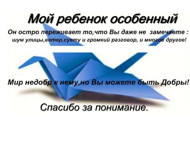 кричащего и катающегося по полу в супермаркете, подумайте, что он на самом деле вовсе не избалован родителями, а оглушён и напуган навалившимися на него ощущениями. Или, может быть, это единственный доступный ему способ выразить свой протест, достучаться до нас из его реальности. А его маме, в этот момент пытающейся помочь своему ребёнку, совсем не нужны замечания или неуместное внимание окружающих. Всё, что ей нужно - это просто понимание, а иногда - элементарная физическая помощь: вовремя поддержанная дверь или поданная сумка.