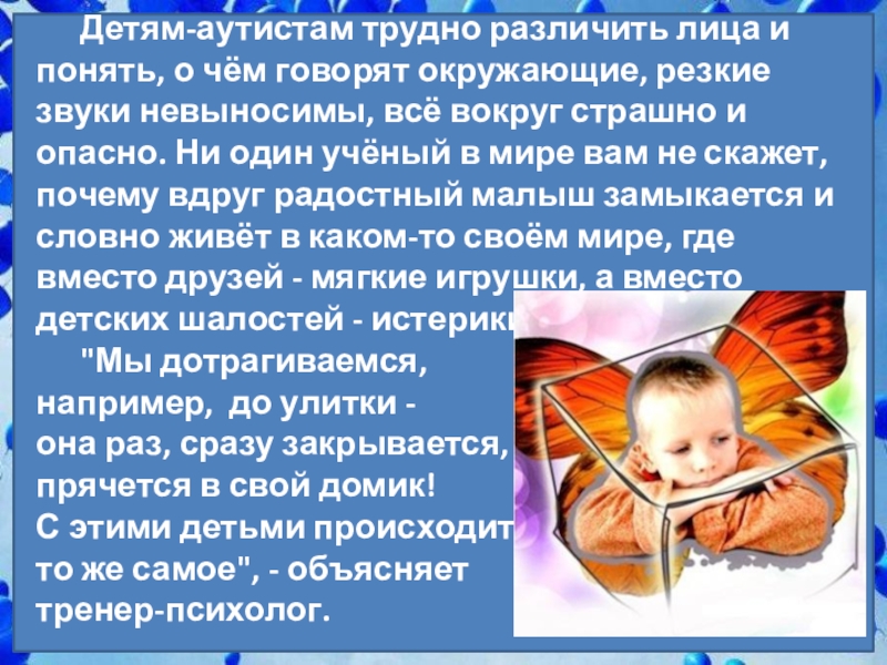 Слайд 6Детям-аутистам трудно различить лица и понять, о чём говорят окружающие, резкие