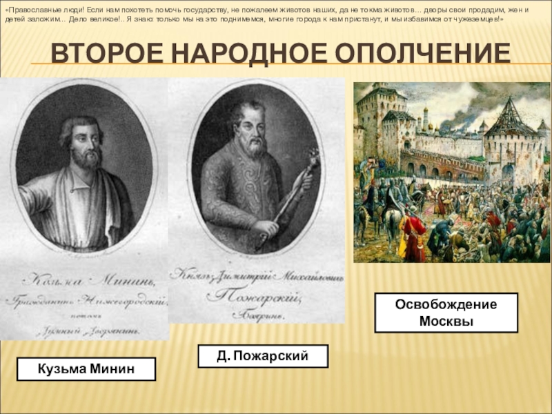 «Православные люди! Если нам похотеть помочь государству, не пожалеем животов наших, дворы свои продадим, жен и детей заложим. Дело великое! Я знаю: токмо мы на это подымемся, многие города к нам пристанут, и мы избавимся от чужеземцев»