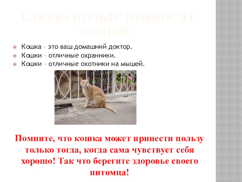 Помните, что кошка может принести пользу только тогда, когда сама чувствует себя хорошо! Так что берегите здоровье своего питомца!