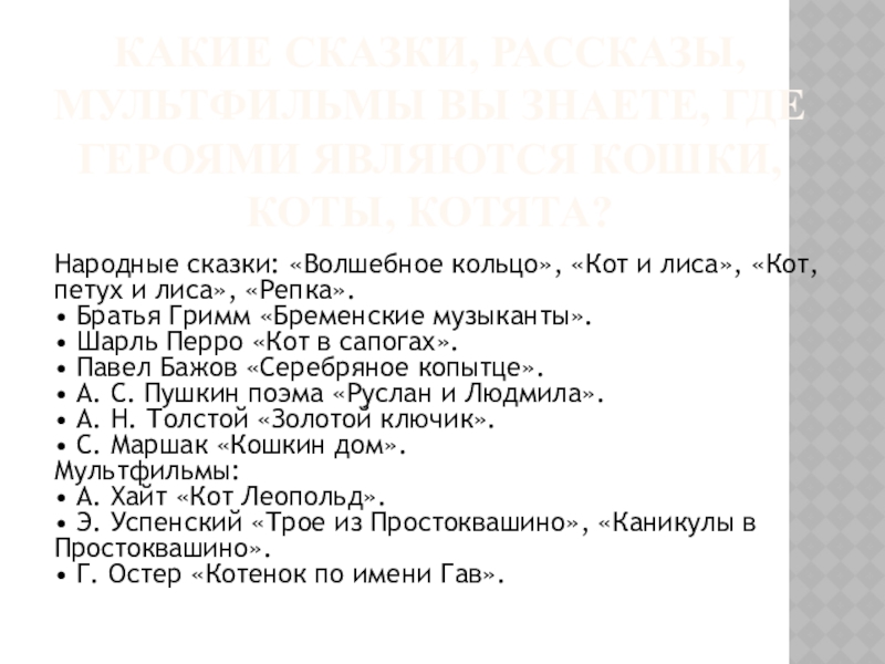 Народные сказки: «Волшебное кольцо», «Кот и лиса», «Кот, петух и лиса», «Репка».