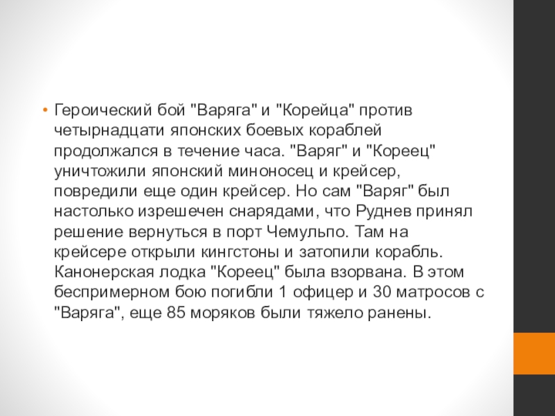 в течение часа. "Варяг" и "Кореец" уничтожили японский миноносец и крейсер, повредили еще один крейсер. Но сам "Варяг" был настолько изрешечен снарядами, что Руднев принял решение вернуться в порт Чемульпо. Там на крейсере открыли кингстоны и затопили корабль. Канонерская лодка "Кореец" была взорвана. В этом беспримерном бою погибли 1 офицер и 30 матросов с "Варяга", еще 85 моряков были тяжело ранены.