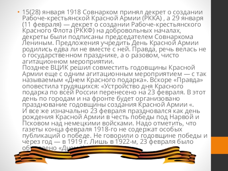 (РККА) , а 29 января (11 февраля) — декрет о создании Рабоче-крестьянского Красного Флота (РККФ) на добровольных началах, декреты были подписаны председателем Совнаркома Лениным. Предложения учредить День Красной Армии родились едва ли не вместе с ней. Правда, речь велась не о государственном празднике, а о разовом, чисто агитационном мероприятии.