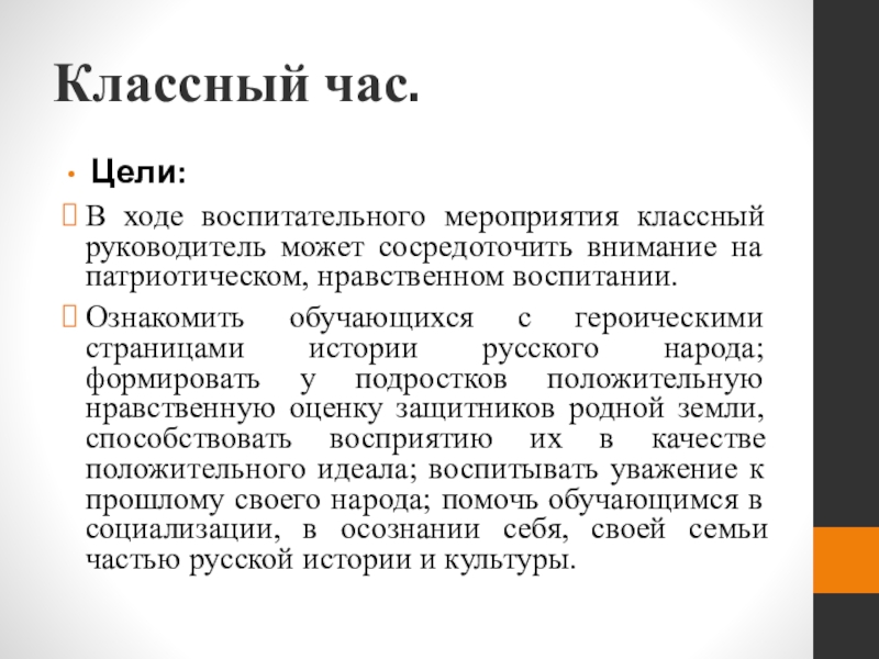 Ознакомить обучающихся с героическими страницами истории русского народа; формировать у подростков положительную нравственную оценку защитников родной земли, способствовать восприятию их в качестве положительного идеала; воспитывать уважение к прошлому своего народа; помочь обучающимся в социализации, в осознании себя, своей семьи частью русской истории и культуры.