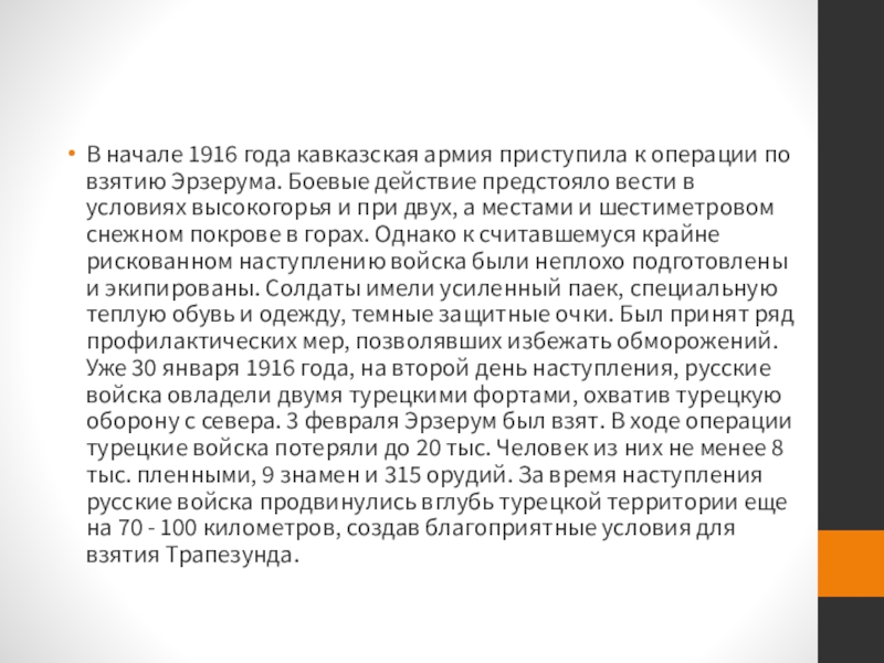Эрзерума. Боевые действие предстояло вести в условиях высокогорья и при двух, а местами и шестиметровом снежном покрове в горах. Однако к считавшемуся крайне рискованном наступлению войска были неплохо подготовлены и экипированы. Солдаты имели усиленный паек, специальную теплую обувь и одежду, темные защитные очки. Был принят ряд профилактических мер, позволявших избежать обморожений. Уже 30 января 1916 года, на второй день наступления, русские войска овладели двумя турецкими фортами, охватив турецкую оборону с севера. 3 февраля Эрзерум был взят. В ходе операции турецкие войска потеряли до 20 тыс. Человек из них не менее 8 тыс. пленными, 9 знамен и 315 орудий. За время наступления русские войска продвинулись вглубь турецкой территории еще на 70 - 100 километров, создав благоприятные условия для взятия Трапезунда.