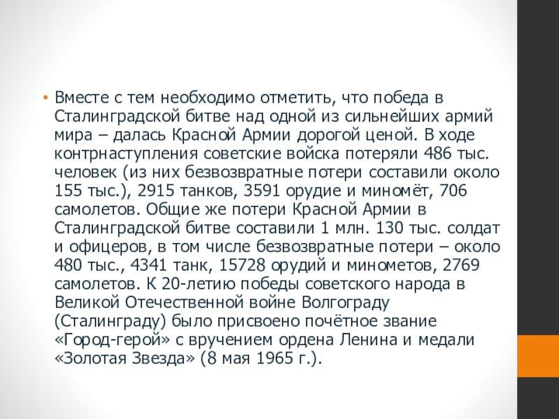 одной из сильнейших армий мира – далась Красной Армии дорогой ценой. В ходе контрнаступления советские войска потеряли 486 тыс. человек (из них безвозвратные потери составили около 155 тыс.), 2915 танков, 3591 орудие и миномёт, 706 самолетов. Общие же потери Красной Армии в Сталинградской битве составили 1 млн. 130 тыс. солдат и офицеров, в том числе безвозвратные потери – около 480 тыс., 4341 танк, 15728 орудий и минометов, 2769 самолетов. К 20-летию победы советского народа в Великой Отечественной войне Волгограду (Сталинграду) было присвоено почётное звание «Город-герой» с вручением ордена Ленина и медали «Золотая Звезда» (8 мая 1965 г.).