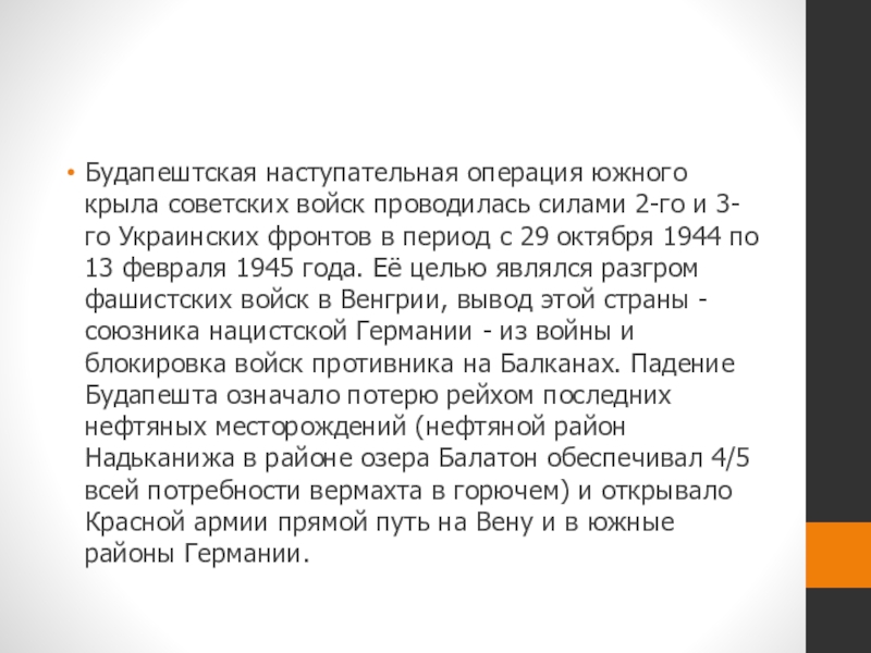 3-го Украинских фронтов в период с 29 октября 1944 по 13 февраля 1945 года. Её целью являлся разгром фашистских войск в Венгрии, вывод этой страны - союзника нацистской Германии - из войны и блокировка войск противника на Балканах. Падение Будапешта означало потерю рейхом последних нефтяных месторождений (нефтяной район Надьканижа в районе озера Балатон обеспечивал 4/5 всей потребности вермахта в горючем) и открывало Красной армии прямой путь на Вену и в южные районы Германии.