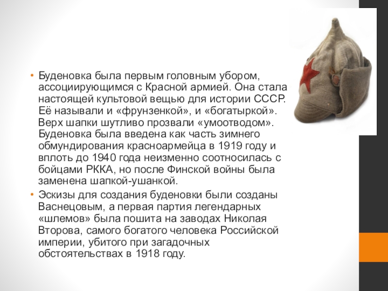 Слайд 29Буденовка была первым головным убором, ассоциирующимся с Красной армией. Она стала