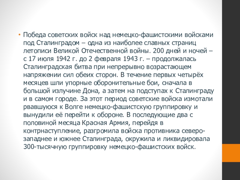 наиболее славных страниц летописи Великой Отечественной войны. 200 дней и ночей – с 17 июля 1942 г. до 2 февраля 1943 г. – продолжалась Сталинградская битва при непрерывно возрастающем напряжении сил обеих сторон. В течение первых четырёх месяцев шли упорные оборонительные бои, сначала в большой излучине Дона, а затем на подступах к Сталинграду и в самом городе. За этот период советские войска измотали рвавшуюся к Волге немецко-фашистскую группировку и вынудили её перейти к обороне. В последующие два с половиной месяца Красная Армия, перейдя в контрнаступление, разгромила войска противника северо-западнее и южнее Сталинграда, окружила и ликвидировала 300-тысячную группировку немецко-фашистских войск.