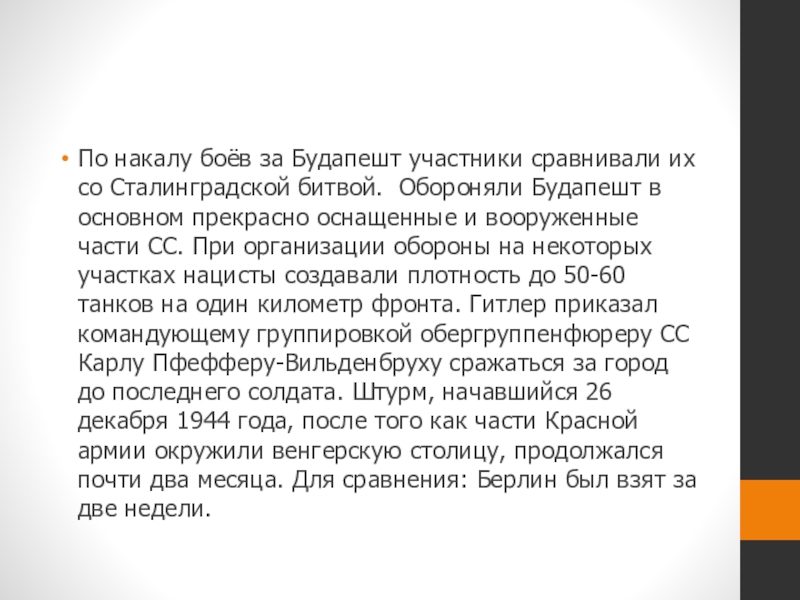 Слайд 16По накалу боёв за Будапешт участники сравнивали их со Сталинградской битвой.