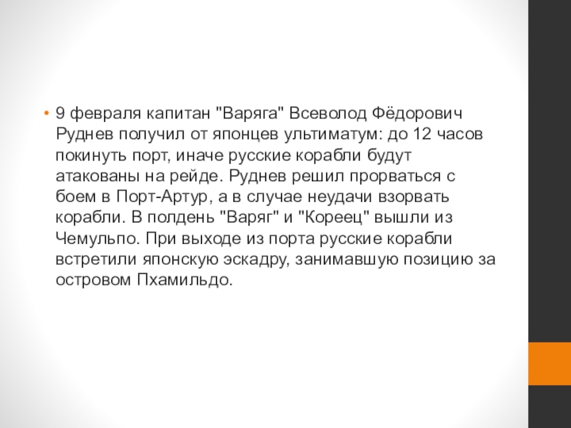 Слайд 119 февраля капитан "Варяга" Всеволод Фёдорович Руднев получил от японцев ультиматум: