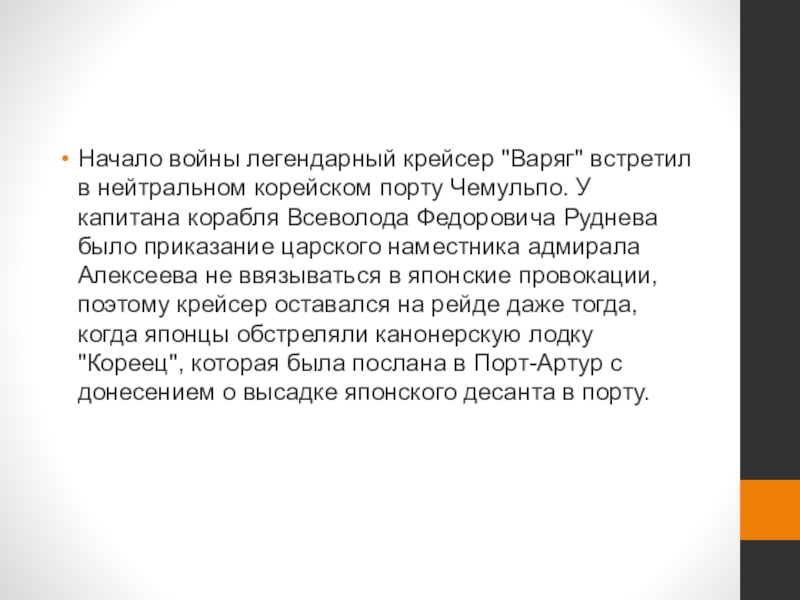 У капитана корабля Всеволода Федоровича Руднева было приказание царского наместника адмирала Алексеева не ввязываться в японские провокации, поэтому крейсер оставался на рейде даже тогда, когда японцы обстреляли канонерскую лодку "Кореец", которая была послана в Порт-Артур с донесением о высадке японского десанта в порту.