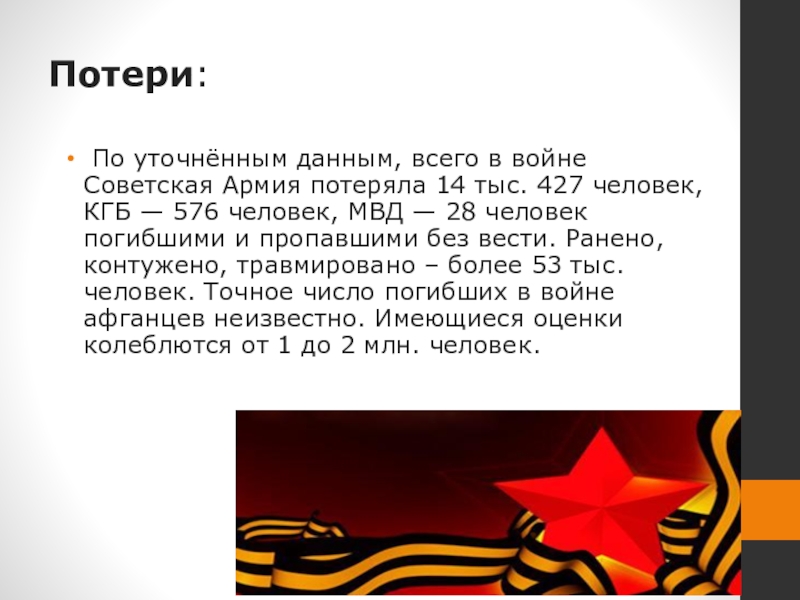 427 человек, КГБ — 576 человек, МВД — 28 человек погибшими и пропавшими без вести. Ранено, контужено, травмировано – более 53 тыс. человек. Точное число погибших в войне афганцев неизвестно. Имеющиеся оценки колеблются от 1 до 2 млн. человек.