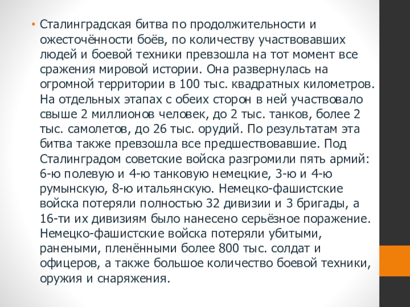 и боевой техники превзошла на тот момент все сражения мировой истории. Она развернулась на огромной территории в 100 тыс. квадратных километров. На отдельных этапах с обеих сторон в ней участвовало свыше 2 миллионов человек, до 2 тыс. танков, более 2 тыс. самолетов, до 26 тыс. орудий. По результатам эта битва также превзошла все предшествовавшие. Под Сталинградом советские войска разгромили пять армий: 6-ю полевую и 4-ю танковую немецкие, 3-ю и 4-ю румынскую, 8-ю итальянскую. Немецко-фашистские войска потеряли полностью 32 дивизии и 3 бригады, а 16-ти их дивизиям было нанесено серьёзное поражение. Немецко-фашистские войска потеряли убитыми, ранеными, пленёнными более 800 тыс. солдат и офицеров, а также большое количество боевой техники, оружия и снаряжения.