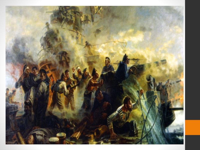 Слайд 13Героический бой "Варяга" и "Корейца" против четырнадцати японских боевых кораблей продолжался