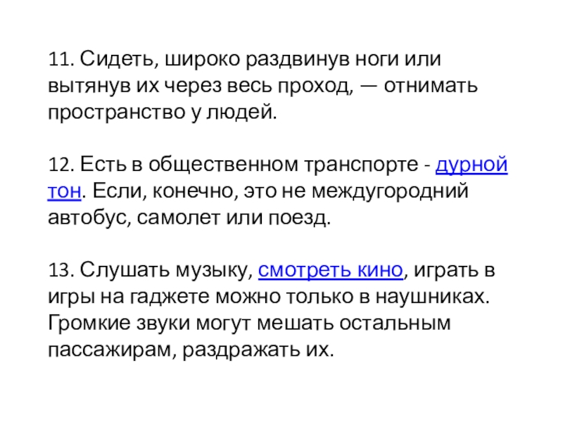 13. Слушать музыку, смотреть кино, играть в игры на гаджете можно только в наушниках. Громкие звуки могут мешать остальным пассажирам, раздражать их.