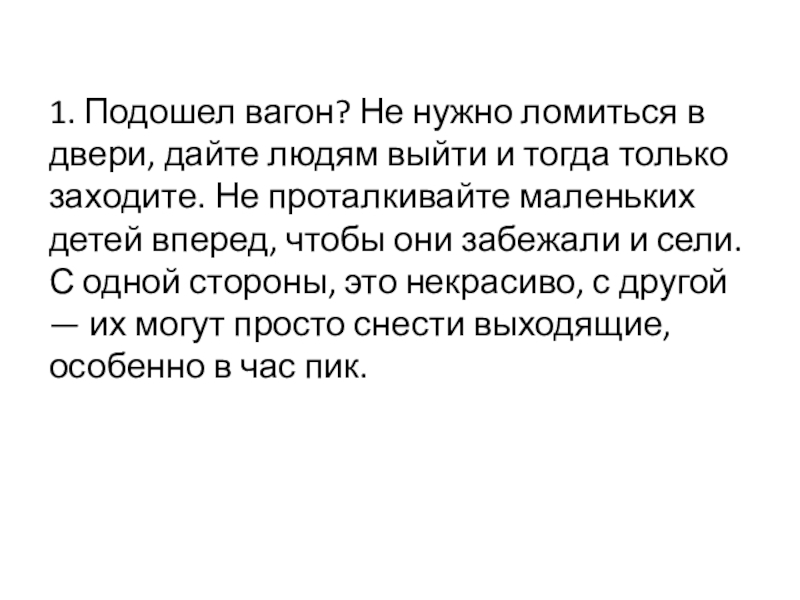 Слайд 121. Подошел вагон? Не нужно ломиться в двери, дайте людям выйти