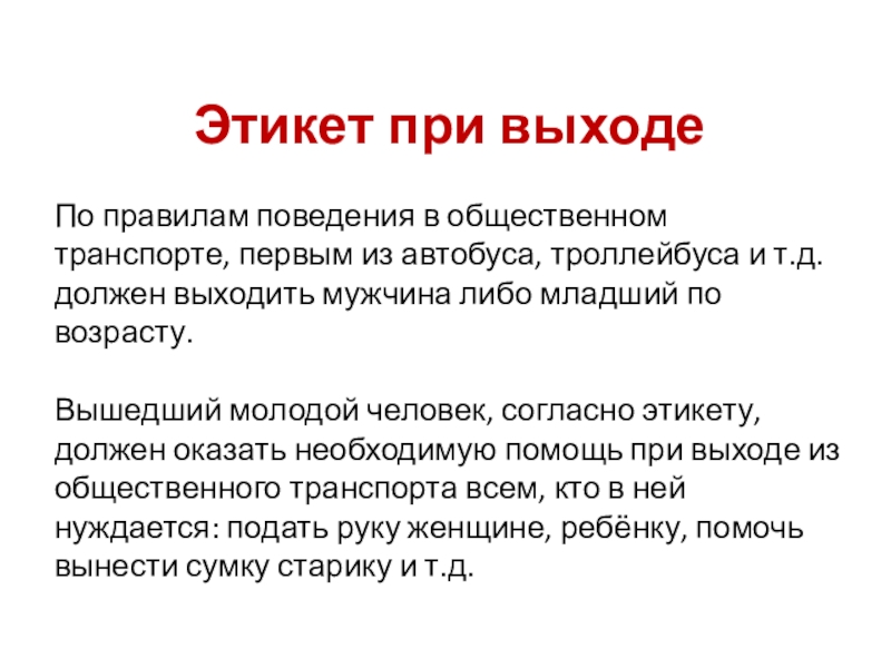 троллейбуса и т.д. должен выходить мужчина либо младший по возрасту.