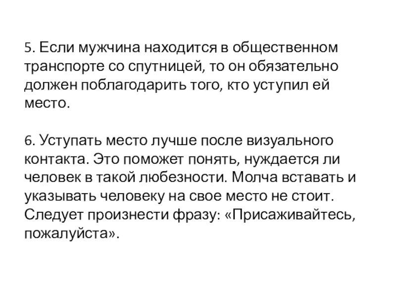 6. Уступать место лучше после визуального контакта. Это поможет понять, нуждается ли человек в такой любезности. Молча вставать и указывать человеку на свое место не стоит. Следует произнести фразу: «Присаживайтесь, пожалуйста».