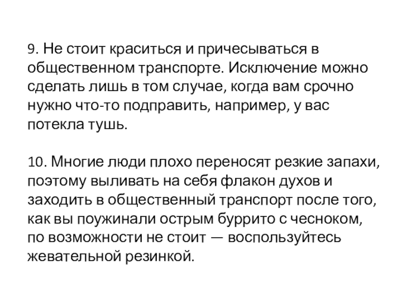 10. Многие люди плохо переносят резкие запахи, поэтому выливать на себя флакон духов и заходить в общественный транспорт после того, как вы поужинали острым буррито с чесноком, по возможности не стоит — воспользуйтесь жевательной резинкой.