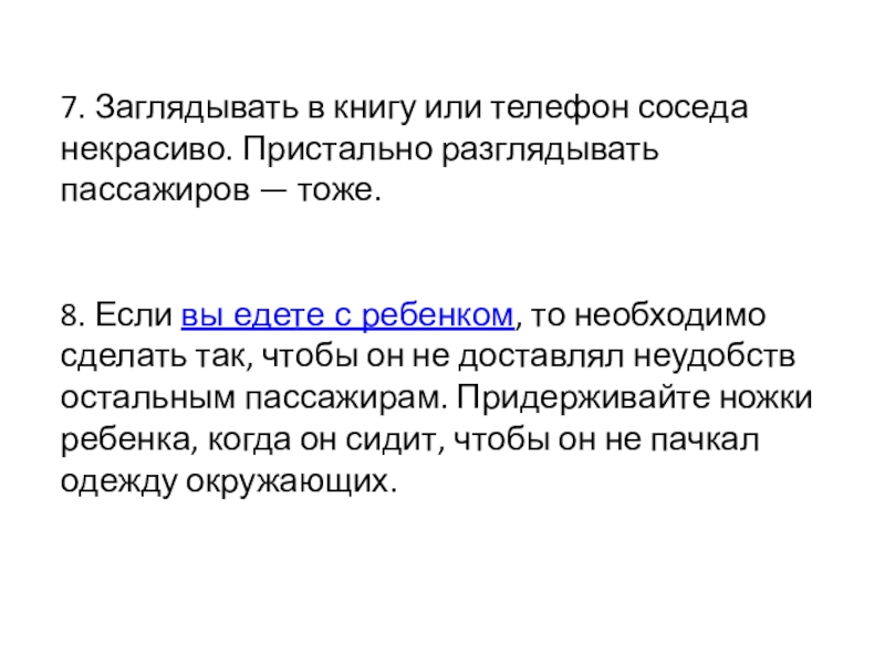 8. Если вы едете с ребенком, то необходимо сделать так, чтобы он не доставлял неудобств остальным пассажирам. Придерживайте ножки ребенка, когда он сидит, чтобы он не пачкал одежду окружающих.