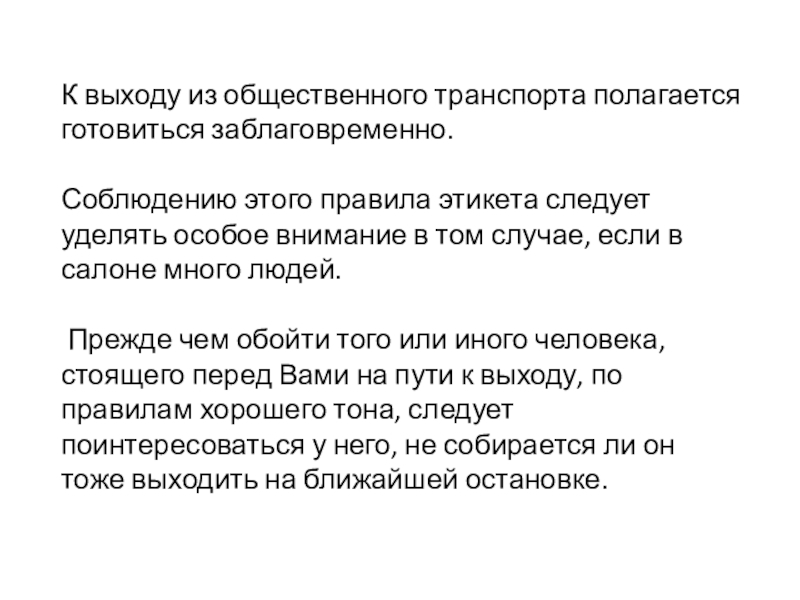 Слайд 10К выходу из общественного транспорта полагается готовиться заблаговременно.