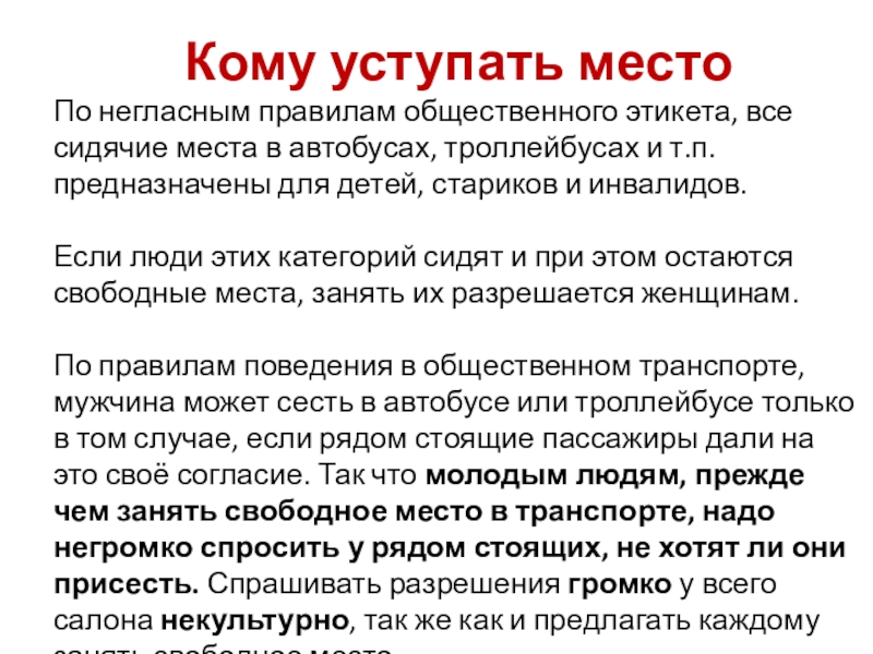 а молодой человек и не думает уступать вам место, то можно его вежливо об этом попросить: «Извините, можно вас попросить уступить мне место?» Это не считается дурным тоном.