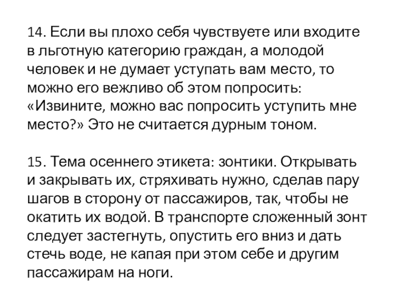 15. Тема осеннего этикета: зонтики. Открывать и закрывать их, стряхивать нужно, сделав пару шагов в сторону от пассажиров, так, чтобы не окатить их водой. В транспорте сложенный зонт следует застегнуть, опустить его вниз и дать стечь воде, не капая при этом себе и другим пассажирам на ноги.