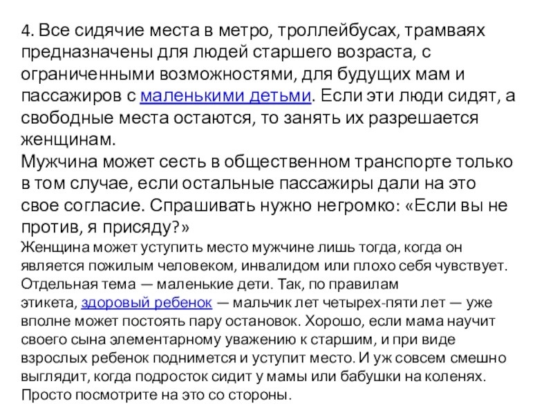 Отдельная тема — маленькие дети. Так, по правилам этикета, здоровый ребенок — мальчик лет четырех-пяти лет — уже вполне может постоять пару остановок. Хорошо, если мама научит своего сына элементарному уважению к старшим, и при виде взрослых ребенок поднимется и уступит место. И уж совсем смешно выглядит, когда подросток сидит у мамы или бабушки на коленях. Просто посмотрите на это со стороны.