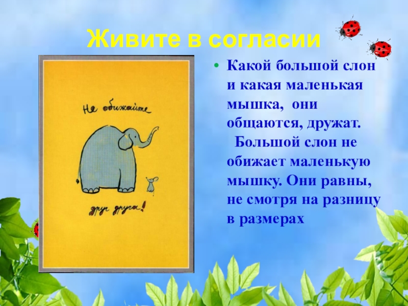 Живите в согласии Какой большой слон и какая маленькая мышка, они общаются, дружат.   Большой слон
