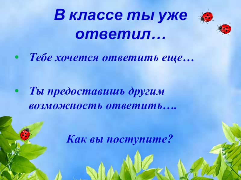 В классе ты уже ответил… Тебе хочется ответить еще…Ты предоставишь другим возможность ответить….