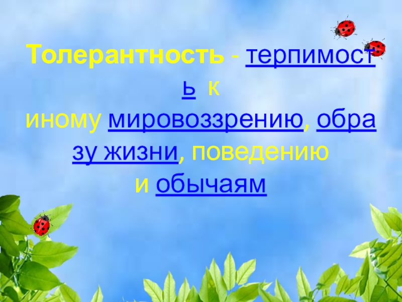 Слайд 2Толерантность - терпимость  к иному мировоззрению, образу жизни, поведению и обычаям