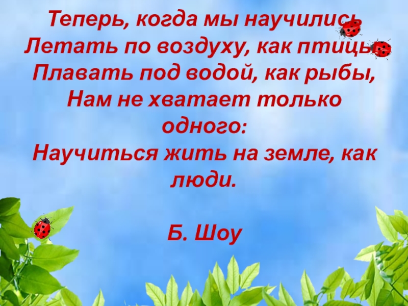 Теперь, когда мы научились Летать по воздуху, как птицы, Плавать под водой, как рыбы, Нам не хватает