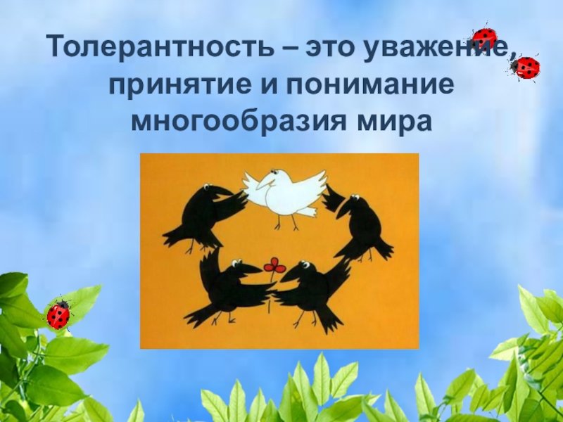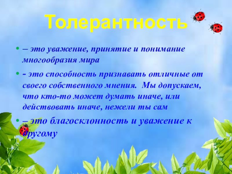 Слайд 3Толерантность – это уважение, принятие и понимание многообразия мира