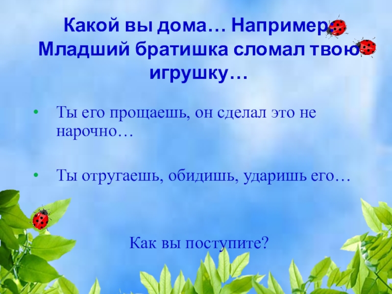 Слайд 8Какой вы дома… Например: Младший братишка сломал твою игрушку…