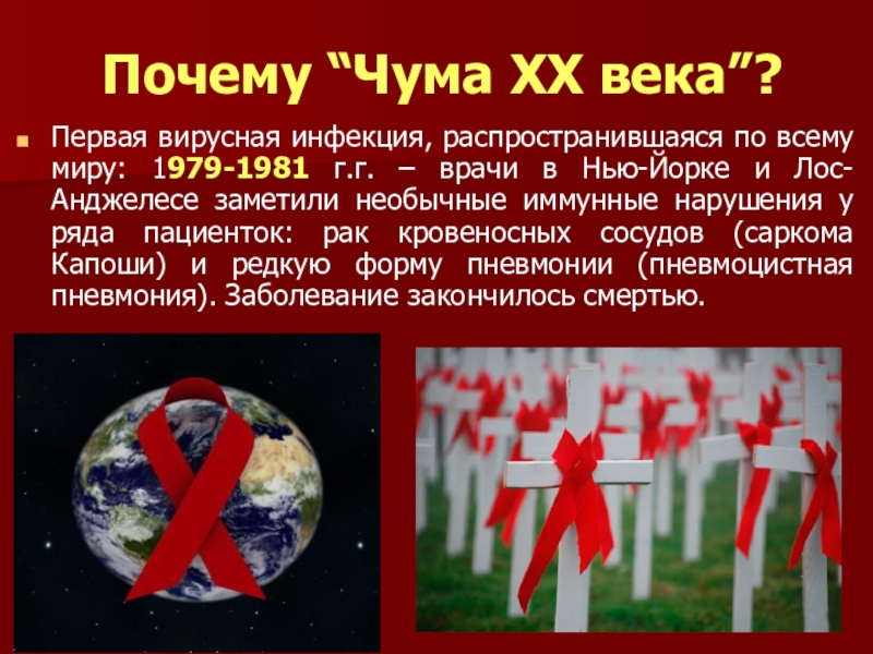 в Нью-Йорке и Лос-Анджелесе заметили необычные иммунные нарушения у ряда пациенток: рак кровеносных сосудов (саркома Капоши) и редкую форму пневмонии (пневмоцистная пневмония). Заболевание закончилось смертью.