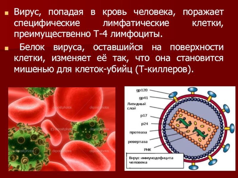 Слайд 15Вирус, попадая в кровь человека, поражает специфические лимфатические клетки, преимущественно Т-4