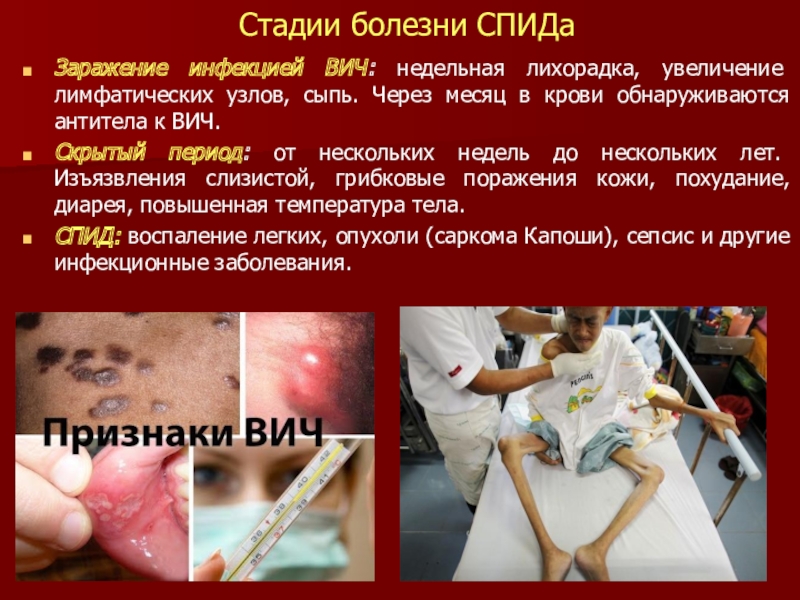 Скрытый период: от нескольких недель до нескольких лет. Изъязвления слизистой, грибковые поражения кожи, похудание, диарея, повышенная температура тела.