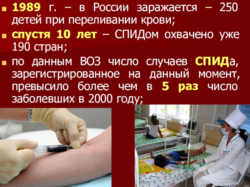 Слайд 131989 г. – в России заражается – 250 детей при переливании