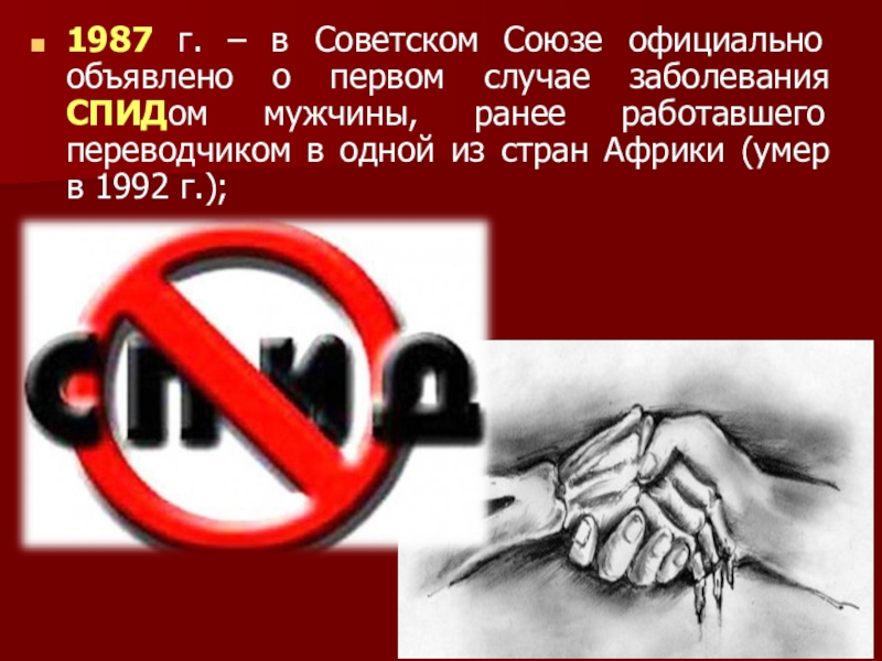 Слайд 111987 г. – в Советском Союзе официально объявлено о первом случае