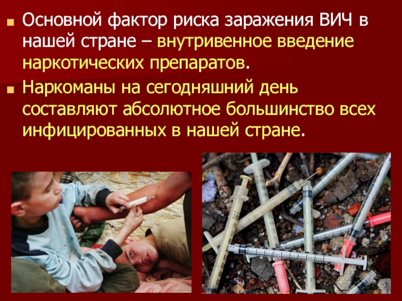 Слайд 20Основной фактор риска заражения ВИЧ в нашей стране – внутривенное введение