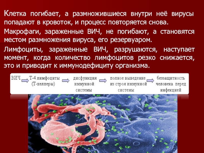 Лимфоциты, зараженные ВИЧ, разрушаются, наступает момент, когда количество лимфоцитов резко снижается, это и приводит к иммунодефициту организма.