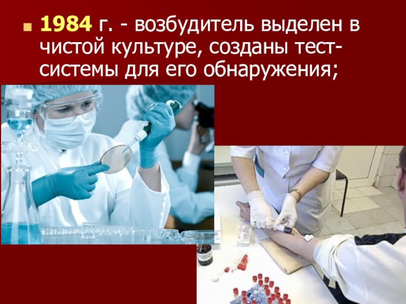 Слайд 101984 г. - возбудитель выделен в чистой культуре, созданы тест-системы для