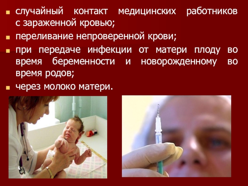 Слайд 19случайный контакт медицинских работников с зараженной кровью;