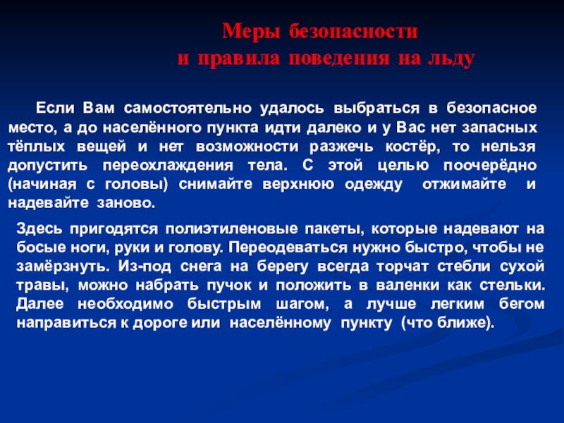 Если Вам самостоятельно удалось выбраться в безопасное место, а до населённого пункта идти далеко и у Вас нет запасных тёплых вещей и нет возможности разжечь костёр, то нельзя допустить переохлаждения тела. С этой целью поочерёдно (начиная с головы) снимайте верхнюю одежду отжимайте и надевайте заново.