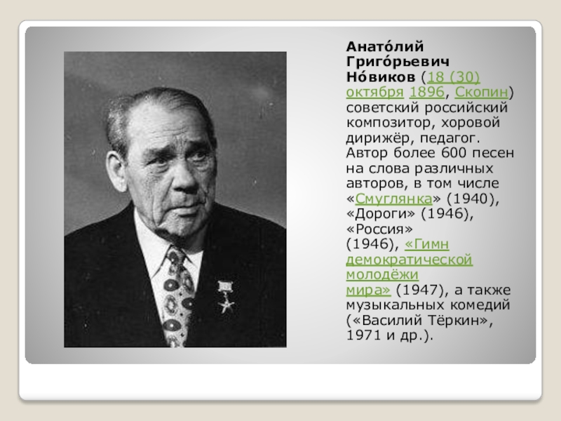 Слайд 22Анато́лий Григо́рьевич Но́виков (18 (30) октября 1896, Скопин) советский российский композитор, хоровой дирижёр, педагог.