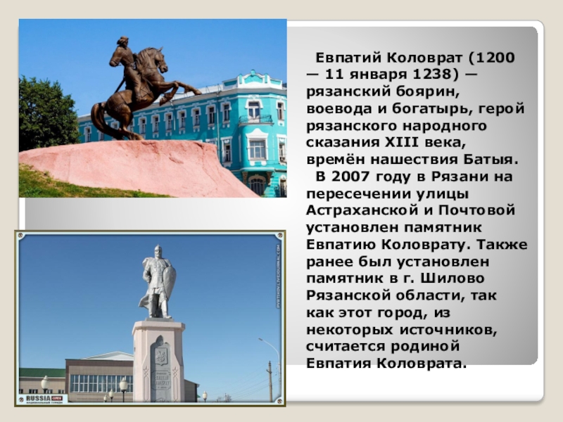 Слайд 6 Евпатий Коловрат (1200 — 11 января 1238) — рязанский боярин, воевода