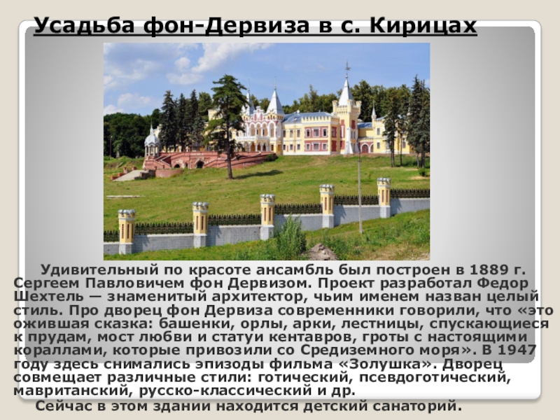 по красоте ансамбль был построен в 1889 г. Сергеем Павловичем фон Дервизом. Проект разработал Федор Шехтель — знаменитый архитектор, чьим именем назван целый стиль. Про дворец фон Дервиза современники говорили, что «это ожившая сказка: башенки, орлы, арки, лестницы, спускающиеся к прудам, мост любви и статуи кентавров, гроты с настоящими кораллами, которые привозили со Средиземного моря». В 1947 году здесь снимались эпизоды фильма «Золушка». Дворец совмещает различные стили: готический, псевдоготический, мавританский, русско-классический и др.